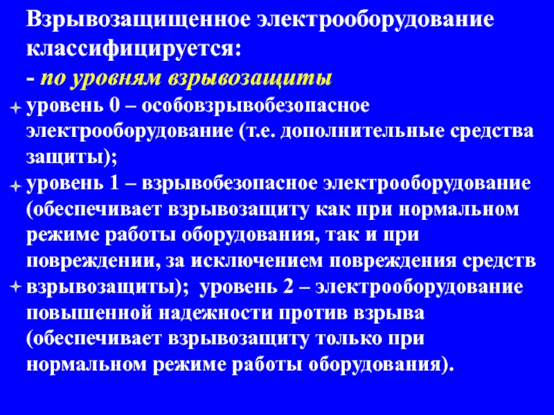 - по уровням взрывозащиты уровень 0 – особовзрывобезопасное электрооборудование (т.е. дополнительные средства защиты); уровень 1 – взрывобезопасное электрооборудование (обеспечивает взрывозащиту как при нормальном режиме работы оборудования, так и при повреждении, за исключением повреждения средств взрывозащиты); уровень 2 – электрооборудование повышенной надежности против взрыва (обеспечивает взрывозащиту только при нормальном режиме работы оборудования).