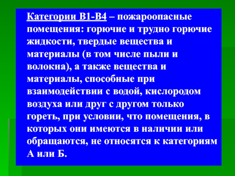 жидкости с температурой вспышки 61оС и более; П-II – зоны, расположенные в помещениях, в которых выделяются горючие пыли или волокна; П-IIа – зоны, расположенные в помещениях, в которых обращаются твердые горючие вещества в количестве, при котором удельная пожарная нагрузка составляет не менее 1 МДж/м2; П-III – зоны, расположенные вне зданий, в которых обращаются горючие жидкости с температурой вспышки 61оС и более или любые твердые горючие вещества.