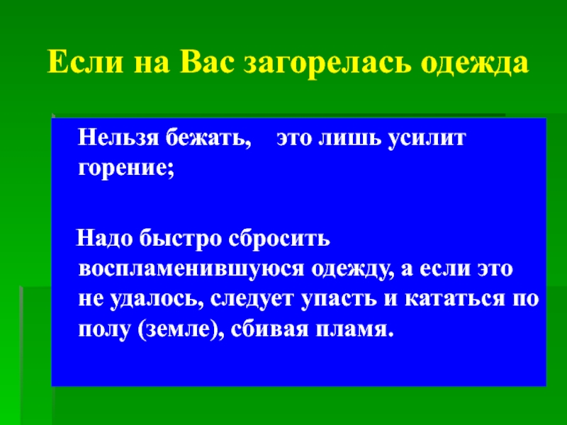 а если это не удалось, следует упасть и кататься по полу (земле), сбивая пламя.