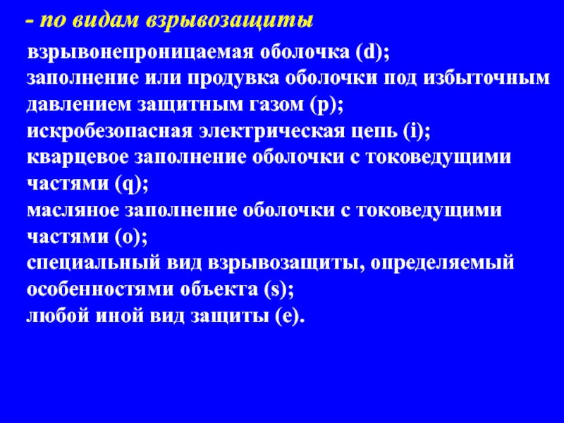 заполнение или продувка оболочки под избыточным давлением защитным газом (p); искробезопасная электрическая цепь (i); кварцевое заполнение оболочки с токоведущими частями (q); масляное заполнение оболочки с токоведущими частями (o); специальный вид взрывозащиты, определяемый особенностями объекта (s); любой иной вид защиты (e).