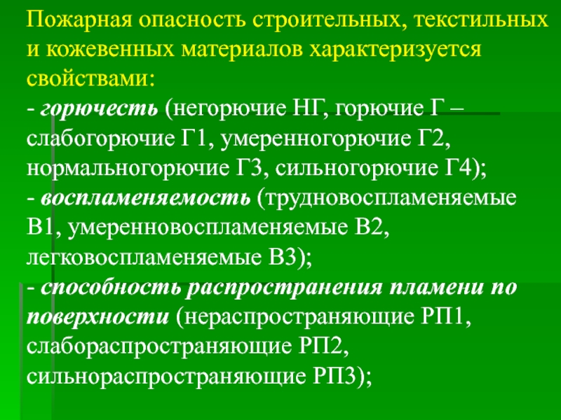 - горючесть (негорючие НГ, горючие Г – слабогорючие Г1, умеренногорючие Г2, нормальногорючие Г3, сильногорючие Г4); - воспламеняемость (трудновоспламеняемые В1, умеренновоспламеняемые В2, легковоспламеняемые В3); - способность распространения пламени по поверхности (нераспространяющие РП1, слабораспространяющие РП2, сильнораспространяющие РП3);