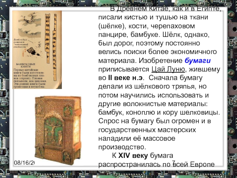 был дорог, поэтому постоянно велись поиски более экономичного материала. Изобретение бумаги приписывается Цай Луню, жившему во II веке н.э. Сначала бумагу делали из шёлкового тряпья, но потом научились использовать и другие волокнистые материалы: бамбук, коноплю и кору шелковицы. Спрос на бумагу был огромен и в государственных мастерских наладили её массовое производство.