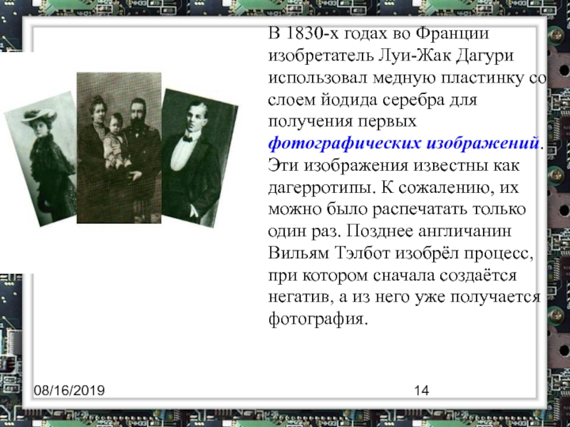 Эти изображения известны как дагерротипы. К сожалению, их можно было распечатать только один раз. Позднее англичанин Вильям Тэлбот изобрёл процесс, при котором сначала создаётся негатив, а из него уже получается фотография.