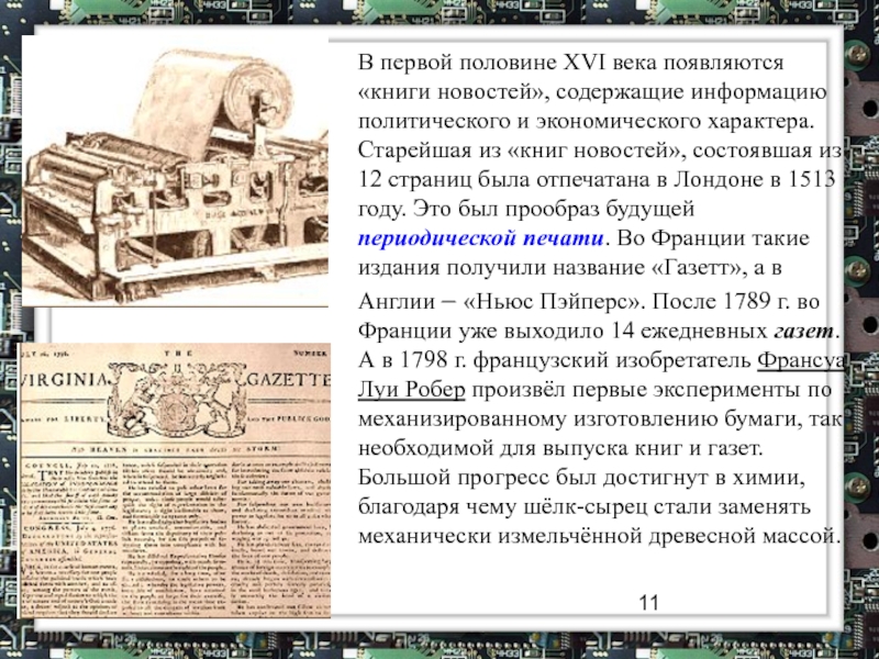 12 страниц была отпечатана в Лондоне в 1513 году. Это был прообраз будущей периодической печати. Во Франции такие издания получили название «Газетт», а в Англии – «Ньюс Пэйперс». После 1789 г. во Франции уже выходило 14 ежедневных газет. А в 1798 г. французский изобретатель Франсуа Луи Робер произвёл первые эксперименты по механизированному изготовлению бумаги, так необходимой для выпуска книг и газет. Большой прогресс был достигнут в химии, благодаря чему шёлк-сырец стали заменять механически измельчённой древесной массой.