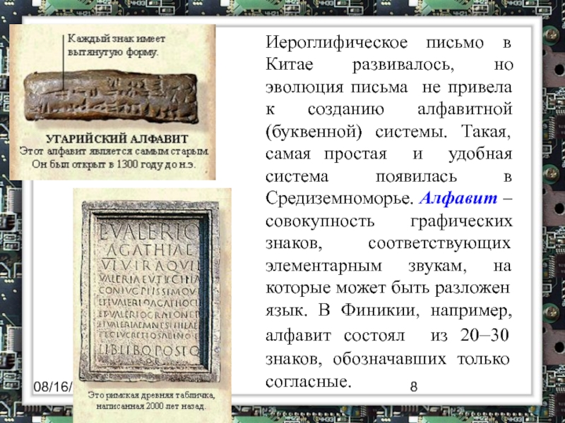 система появилась в Средиземноморье. Алфавит – совокупность графических знаков, соответствующих элементарным звукам, на которые может быть разложен язык. В Финикии, например, алфавит состоял из 20–30 знаков, обозначавших только согласные.