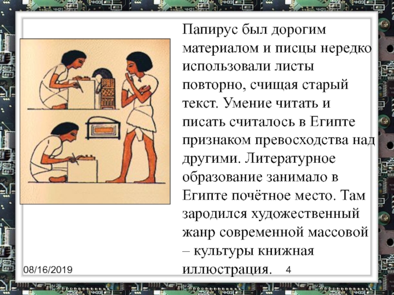 признаком превосходства над другими. Литературное образование занимало в Египте почётное место. Там зародился художественный жанр современной массовой – культуры книжная иллюстрация.