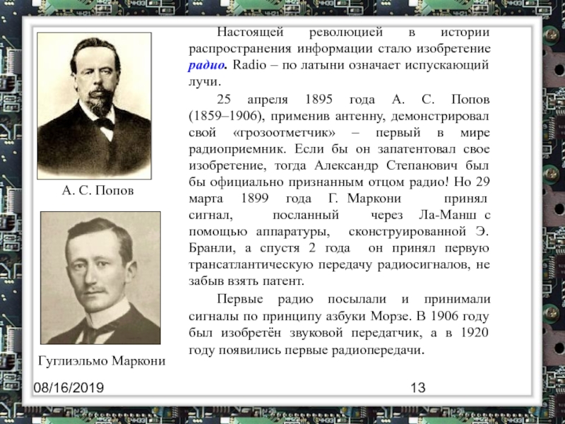 А. С. Попов (1859–1906), применив антенну, демонстрировал свой «грозоотметчик» – первый в мире радиоприемник. Если бы он запатентовал свое изобретение, тогда Александр Степанович был бы официально признанным отцом радио! Но 29 марта 1899 года Г. Маркони принял сигнал, посланный через Ла-Манш с помощью аппаратуры, сконструированной Э. Бранли, а спустя 2 года он принял первую трансатлантическую передачу радиосигналов, не забыв взять патент.