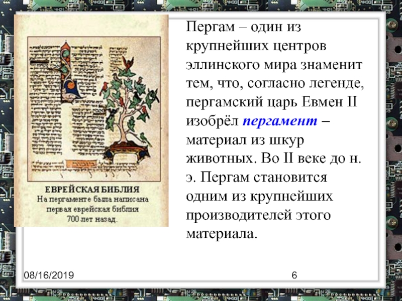 материал из шкур животных. Во II веке до н.э. Пергам становится одним из крупнейших производителей этого материала.