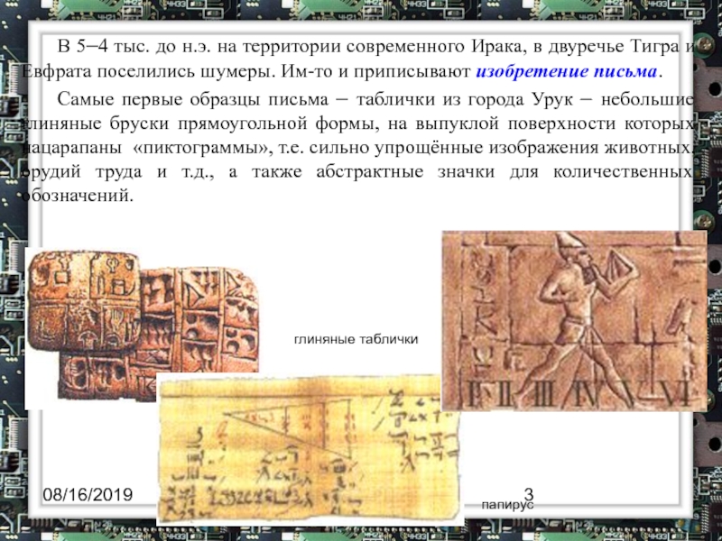 Самые первые образцы письма – таблички из города Урук – небольшие глиняные бруски прямоугольной формы, на выпуклой поверхности которых нацарапаны «пиктограммы», т.е. сильно упрощённые изображения животных, орудий труда и т.д., а также абстрактные значки для количественных обозначений.