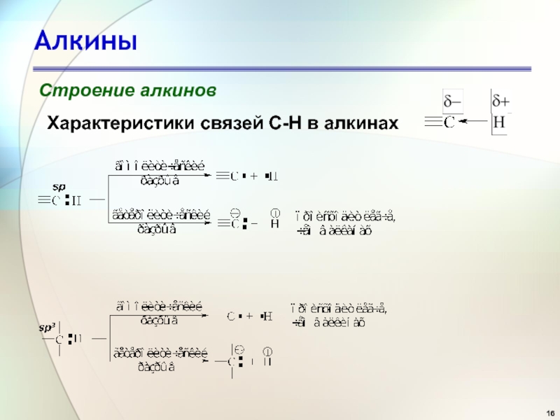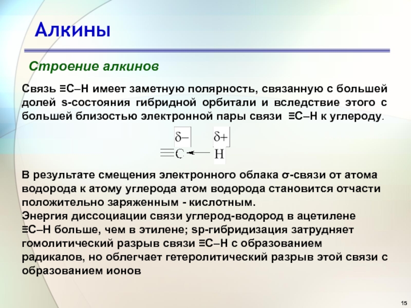В результате смещения электронного облака σ-связи от атома водорода к атому углерода атом водорода становится отчасти положительно заряженным - кислотным.