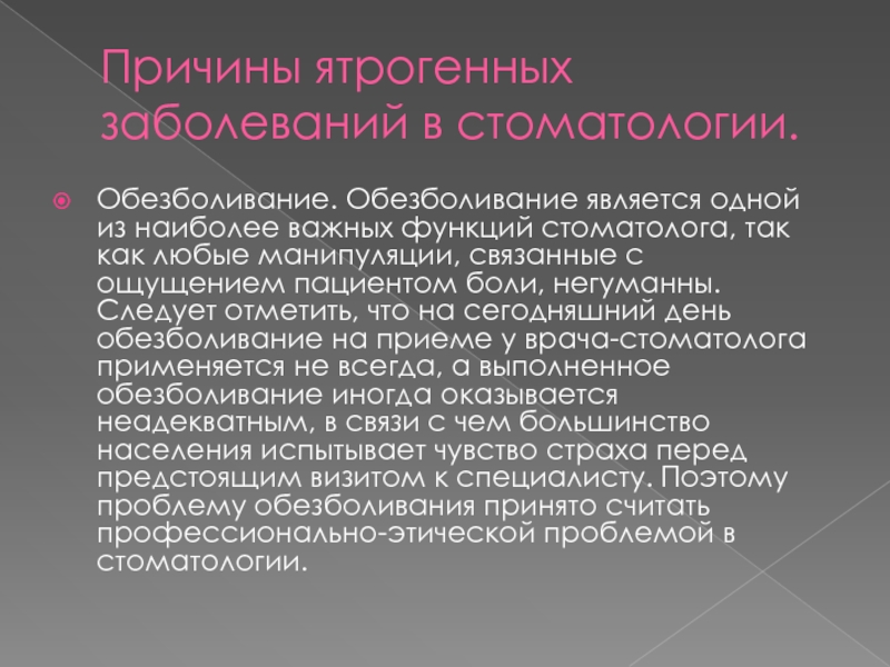 Причины ятрогенных заболеваний в стоматологии.Обезболивание. Обезболивание является одной из наиболее важных функций стоматолога, так как любые манипуляции,