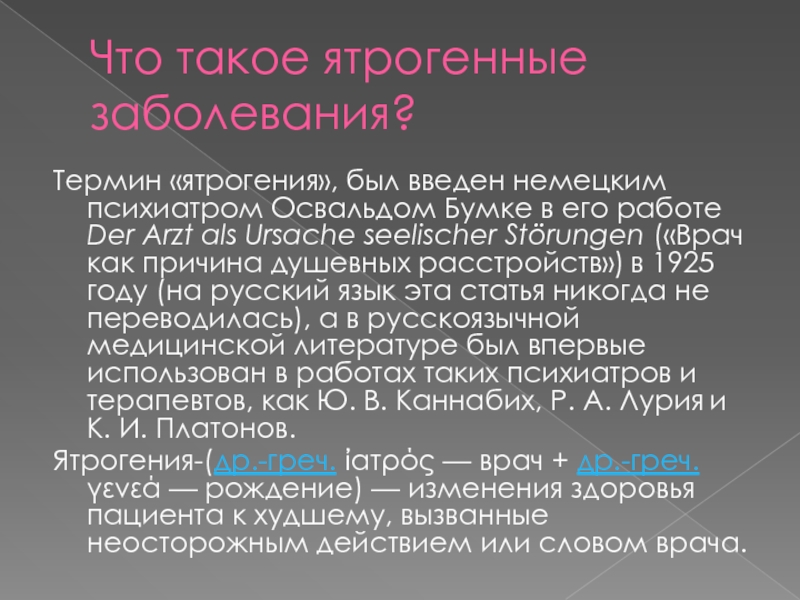 («Врач как причина душевных расстройств») в 1925 году (на русский язык эта статья никогда не переводилась), а в русскоязычной медицинской литературе был впервые использован в работах таких психиатров и терапевтов, как Ю. В. Каннабих, Р. А. Лурия и К. И. Платонов.