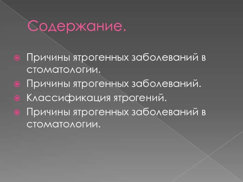 Содержание.Причины ятрогенных заболеваний в стоматологии.Причины ятрогенных заболеваний.Классификация ятрогений. Причины ятрогенных заболеваний в стоматологии.