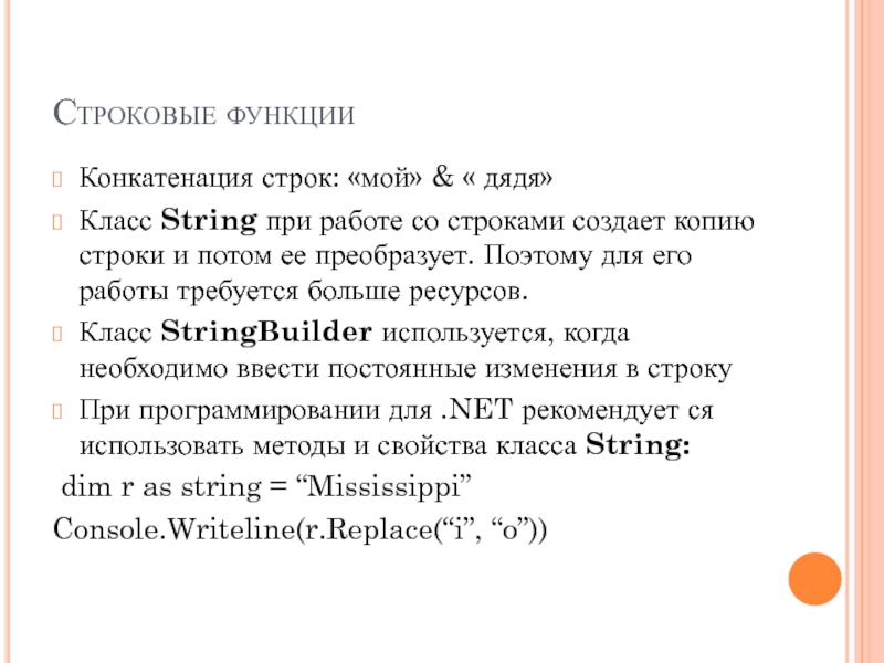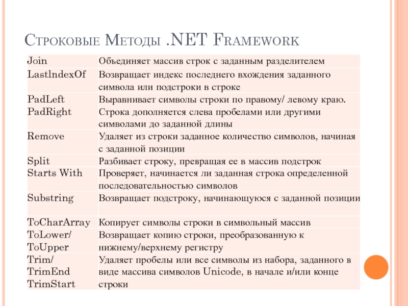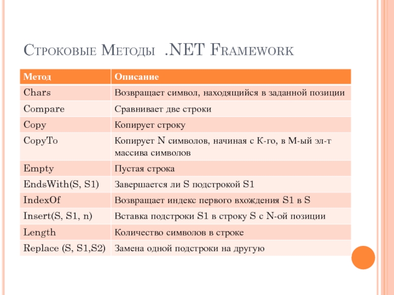 При программировании для .NET рекомендует ся использовать методы и свойства класса String:
