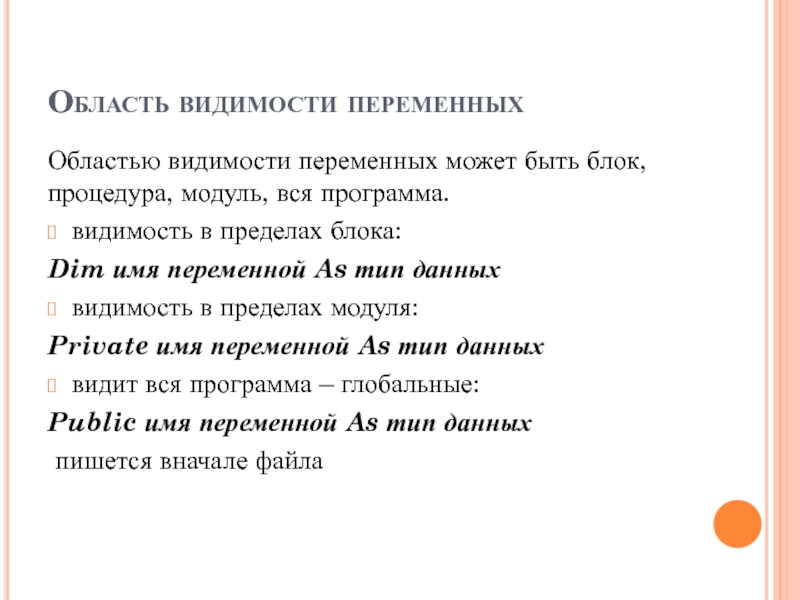 Private имя переменной As тип данных