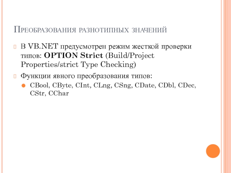 В VB.NET предусмотрен режим жесткой проверки типов: OPTION