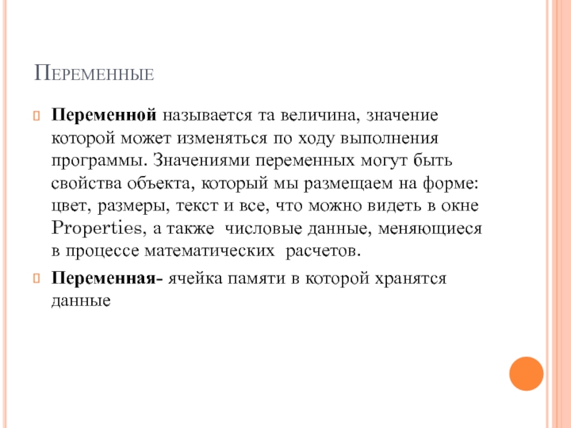 присваиваться числовые, текстовые значения, значения свойств объектов, других переменных. Переменные