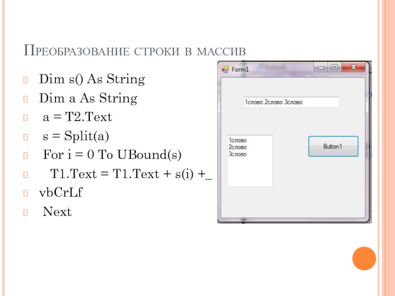 Слайд 28Преобразование строки в массив
