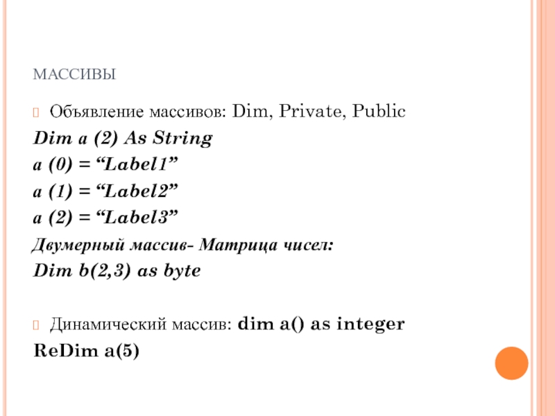 Объявление массивов: Dim, Private, Public