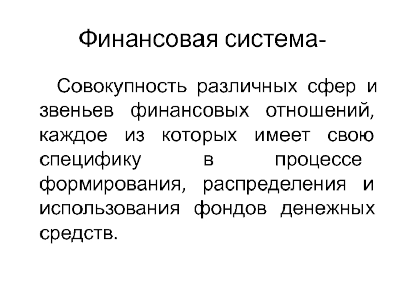 Финансовая система-  Совокупность различных сфер и звеньев финансовых отношений, каждое из которых имеет свою специфику в