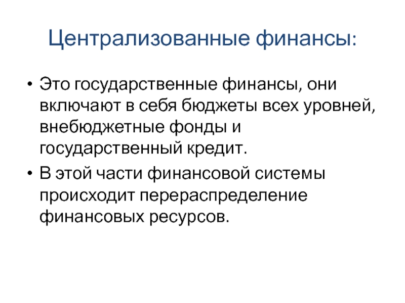 Централизованные финансы:Это государственные финансы, они включают в себя бюджеты всех уровней, внебюджетные фонды и государственный кредит.В этой