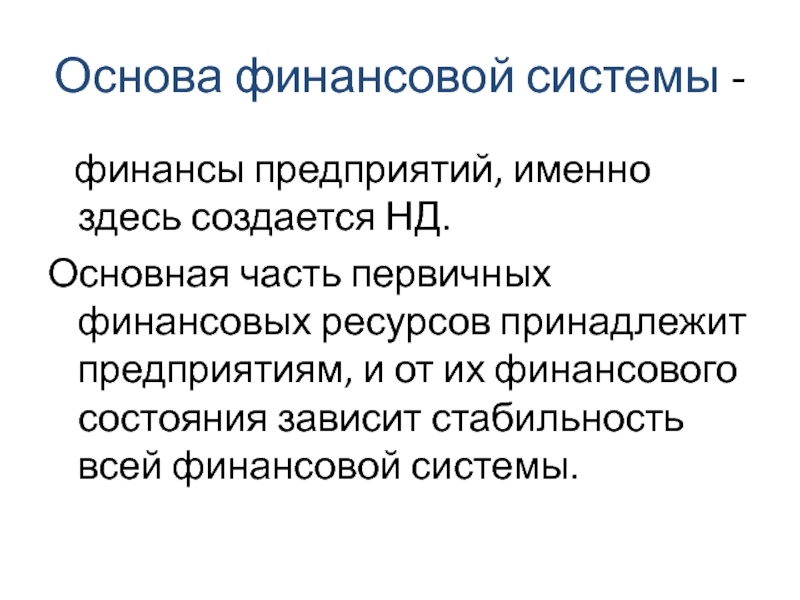 Основа финансовой системы -  финансы предприятий, именно здесь создается НД.Основная часть первичных финансовых ресурсов принадлежит предприятиям,
