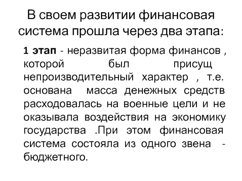 В своем развитии финансовая система прошла через два этапа:  1 этап - неразвитая форма финансов ,