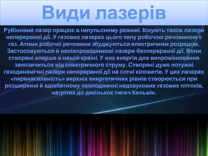 газ. Атоми робочої речовини збуджуються електричним розрядом. Застосовуються й напівпровідникові лазери безперервної дії. Вони створені вперше в нашій країні. У них енергія для випромінювання запозичиться від електричного струму. Створені дуже потужні газодинамічні лазери неперервної дії на сотні кіловатів. У цих лазерах «перенаселеність» верхніх енергетичних рівнів створюється при розширенні й адіабатному охолодженні надзвукових газових потоків, нагрітих до декількох тисяч Кельвін.