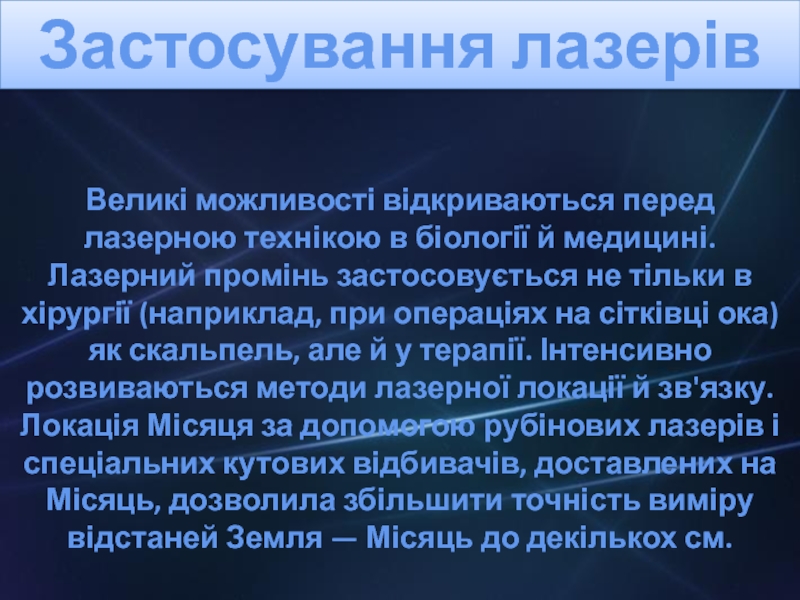 медицині. Лазерний промінь застосовується не тільки в хірургії (наприклад, при