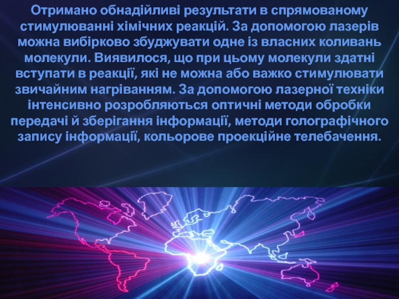 Слайд 25Отримано обнадійливі результати в спрямованому стимулюванні хімічних реакцій. За допомогою