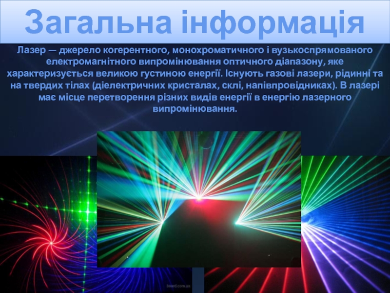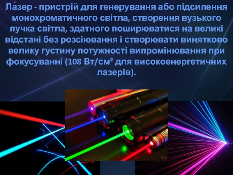 Слайд 2Ла́зер - пристрій для генерування або підсилення монохроматичного світла, створення