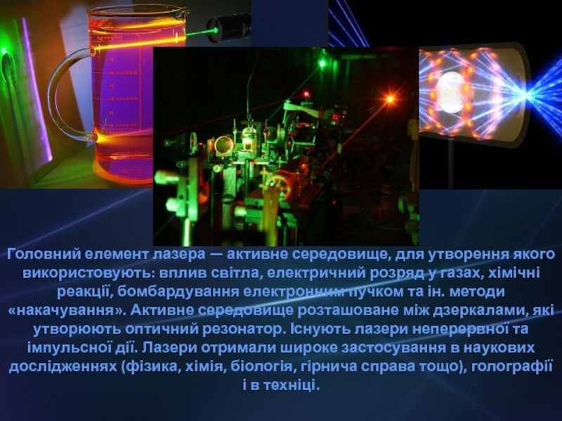 пучком та ін. методи «накачування». Активне середовище розташоване між дзеркалами, які утворюють оптичний резонатор. Існують лазери неперервної та імпульсної дії. Лазери отримали широке застосування в наукових дослідженнях (фізика, хімія, біологія, гірнича справа тощо), голографії і в техніці.