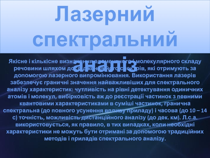 лазерного випромінювання. Використання лазерів забезпечує граничні значення найважливіших для спектрального аналізу характеристик: чутливість на рівні детектування одиничних атомів і молекул, вибірковість аж до реєстрації частинок з певними квантовими характеристиками в суміші частинок, гранична спектральна (до повного усунення впливу приладу) і часова (до 10 – 14 с) точність, можливість дистанційного аналізу (до дек. км). Л.с.а. використовується, як правило, в тих випадках, коли необхідні характеристики не можуть бути отримані за допомогою традиційних методів і приладів спектрального аналізу.