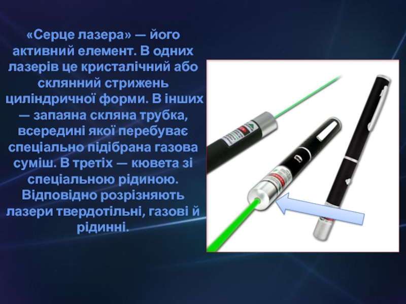 Слайд 19«Серце лазера» — його активний елемент. В одних лазерів це
