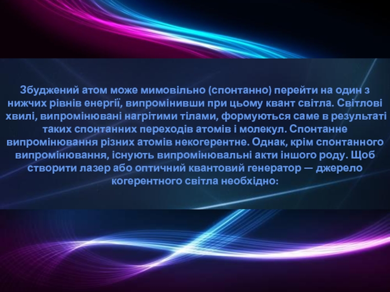 нагрітими тілами, формуються саме в результаті таких спонтанних переходів атомів і молекул. Спонтанне випромінювання різних атомів некогерентне. Однак, крім спонтанного випромінювання, існують випромінювальні акти іншого роду. Щоб створити лазер або оптичний квантовий генератор — джерело когерентного світла необхідно: