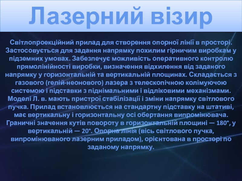 Забезпечує можливість оперативного контролю прямолінійності виробки, визначення відхилення від заданого напрямку у горизонтальній та вертикальній площинах. Складається з газового (гелій-неонового) лазера з телескопічною колімуючою системою і підставки з піднімальними і відліковими механізмами. Моделі Л. в. мають пристрої стабілізації і зміни напрямку світлового пучка. Прилад встановлюється на стандартну підставку на штативі, має вертикальну і горизонтальну осі обертання випромінювача. Граничні значення кутів повороту в горизонтальній площині — 180°, у вертикальній — 20°. Опорна лінія (вісь світлового пучка, випромінюваного лазерним приладом), орієнтована в просторі по заданому напрямку.