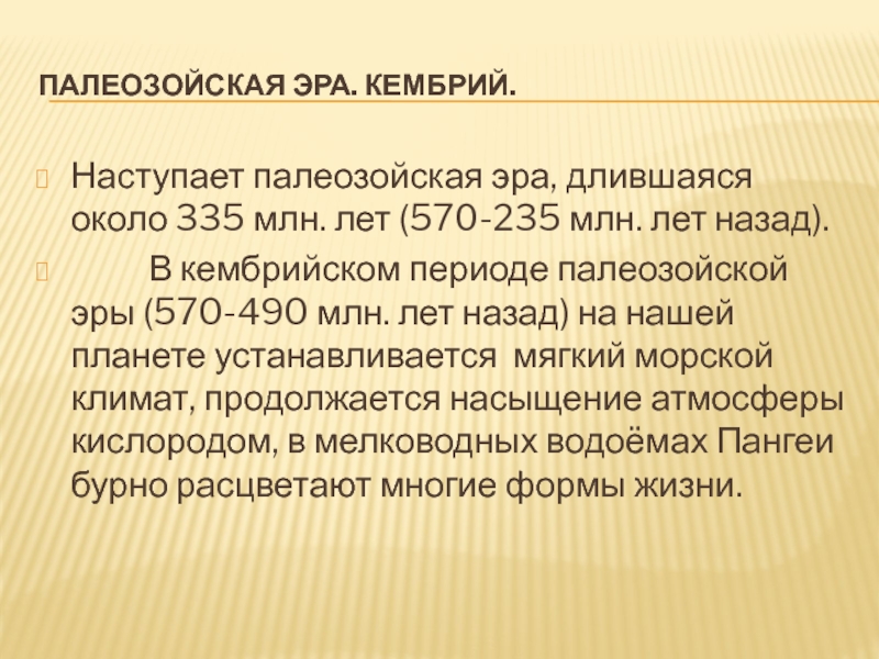 периоде палеозойской эры (570-490 млн. лет назад) на нашей планете устанавливается мягкий морской климат, продолжается насыщение атмосферы кислородом, в мелководных водоёмах Пангеи бурно расцветают многие формы жизни.