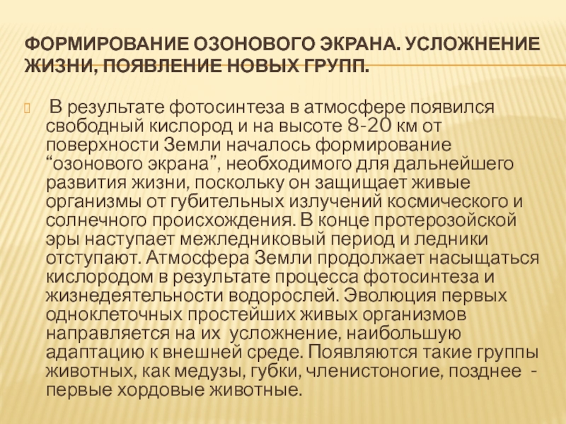 км от поверхности Земли началось формирование “озонового экрана”, необходимого для дальнейшего развития жизни, поскольку он защищает живые организмы от губительных излучений космического и солнечного происхождения. В конце протерозойской эры наступает межледниковый период и ледники отступают. Атмосфера Земли продолжает насыщаться кислородом в результате процесса фотосинтеза и жизнедеятельности водорослей. Эволюция первых одноклеточных простейших живых организмов направляется на их усложнение, наибольшую адаптацию к внешней среде. Появляются такие группы животных, как медузы, губки, членистоногие, позднее - первые хордовые животные.