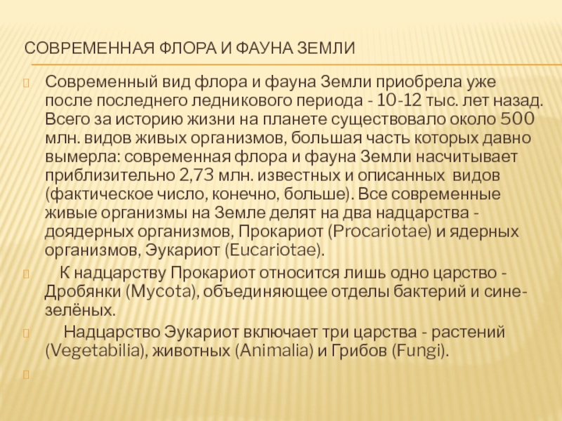 лет назад. Всего за историю жизни на планете существовало около 500 млн. видов живых организмов, большая часть которых давно вымерла: современная флора и фауна Земли насчитывает приблизительно 2,73 млн. известных и описанных видов (фактическое число, конечно, больше). Все современные живые организмы на Земле делят на два надцарства - доядерных организмов, Прокариот (Procariotae) и ядерных организмов, Эукариот (Eucariotae).