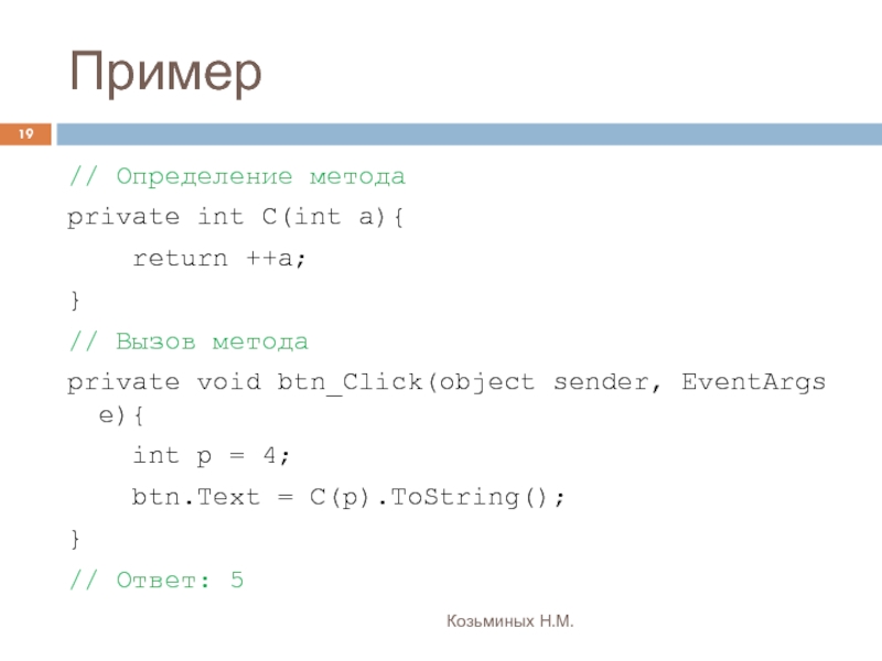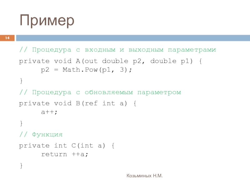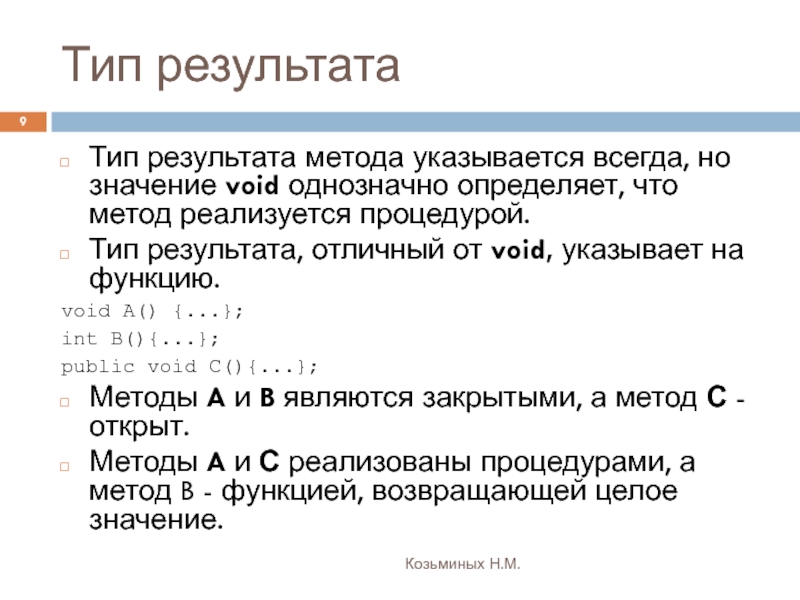 Методы A и С реализованы процедурами, а метод B - функцией, возвращающей целое значение.