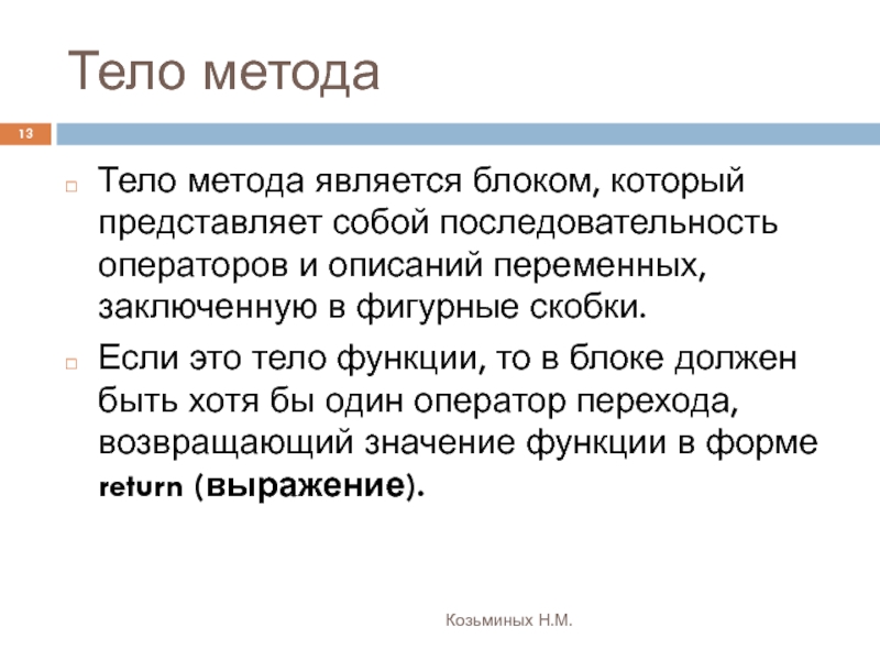 функции, то в блоке должен быть хотя бы один оператор перехода, возвращающий значение функции в форме return (выражение).