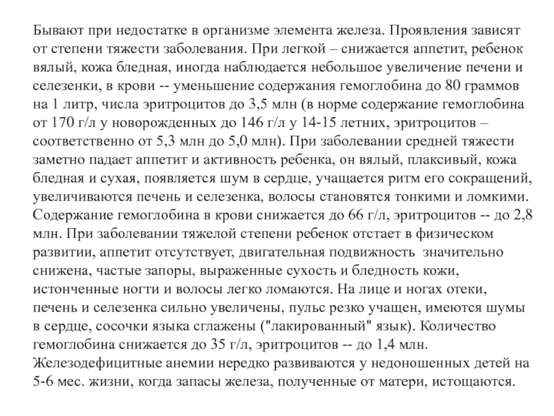 кожа бледная, иногда наблюдается небольшое увеличение печени и селезенки, в крови -- уменьшение содержания гемоглобина до 80 граммов на 1 литр, числа эритроцитов до 3,5 млн (в норме содержание гемоглобина от 170 г/л у новорожденных до 146 г/л у 14-15 летних, эритроцитов – соответственно от 5,3 млн до 5,0 млн). При заболевании средней тяжести заметно падает аппетит и активность ребенка, он вялый, плаксивый, кожа бледная и сухая, появляется шум в сердце, учащается ритм его сокращений, увеличиваются печень и селезенка, волосы становятся тонкими и ломкими. Содержание гемоглобина в крови снижается до 66 г/л, эритроцитов -- до 2,8 млн. При заболевании тяжелой степени ребенок отстает в физическом развитии, аппетит отсутствует, двигательная подвижность значительно снижена, частые запоры, выраженные сухость и бледность кожи, истонченные ногти и волосы легко ломаются. На лице и ногах отеки, печень и селезенка сильно увеличены, пульс резко учащен, имеются шумы в сердце, сосочки языка сглажены ("лакированный" язык). Количество гемоглобина снижается до 35 г/л, эритроцитов -- до 1,4 млн. Железодефицитные анемии нередко развиваются у недоношенных детей на 5-6 мес. жизни, когда запасы железа, полученные от матери, истощаются.