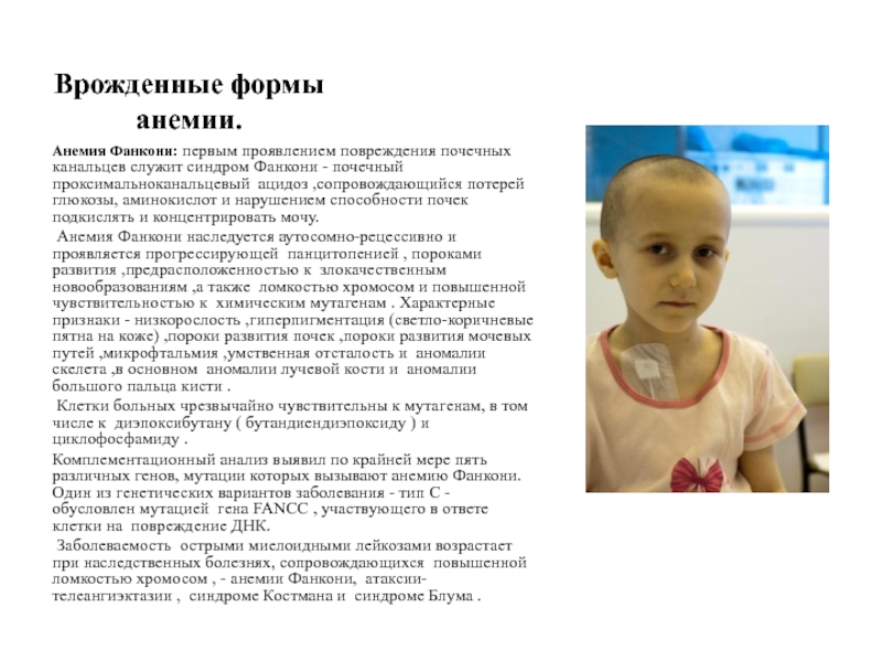 Анемия Фанкони наследуется аутосомно-рецессивно и проявляется прогрессирующей панцитопенией , пороками развития ,предрасположенностью к злокачественным новообразованиям ,а также ломкостью хромосом и повышенной чувствительностью к химическим мутагенам . Характерные признаки - низкорослость ,гиперпигментация (светло-коричневые пятна на коже) ,пороки развития почек ,пороки развития мочевых путей ,микрофтальмия ,умственная отсталость и аномалии скелета ,в основном аномалии лучевой кости и аномалии большого пальца кисти .