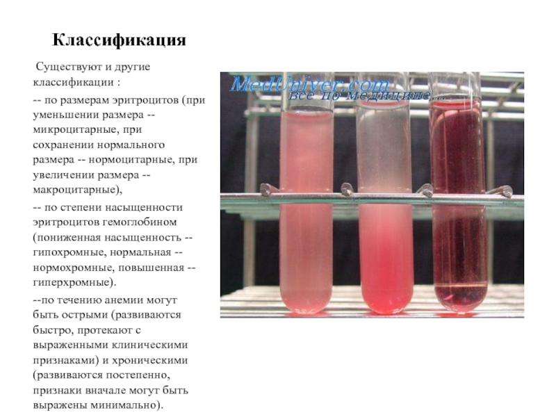 -- по степени насыщенности эритроцитов гемоглобином (пониженная насыщенность -- гипохромные, нормальная --нормохромные, повышенная -- гиперхромные).