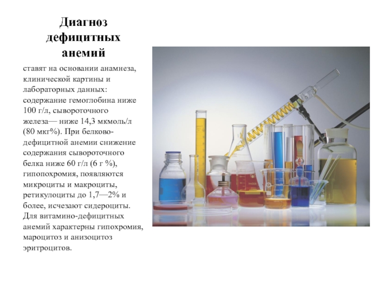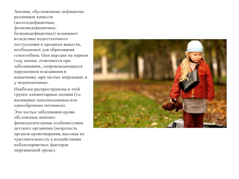 Слайд 4Анемии, обусловленны дефицитом различных веществ (железодефицитные, фолиеводефицитные, белководефицитные) возникают вследствие