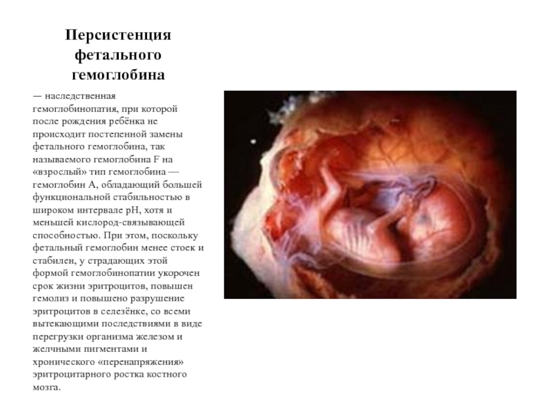F на «взрослый» тип гемоглобина — гемоглобин А, обладающий большей функциональной стабильностью в широком интервале pH, хотя и меньшей кислород-связывающей способностью. При этом, поскольку фетальный гемоглобин менее стоек и стабилен, у страдающих этой формой гемоглобинопатии укорочен срок жизни эритроцитов, повышен гемолиз и повышено разрушение эритроцитов в селезёнке, со всеми вытекающими последствиями в виде перегрузки организма железом и желчными пигментами и хронического «перенапряжения» эритроцитарного ростка костного мозга.