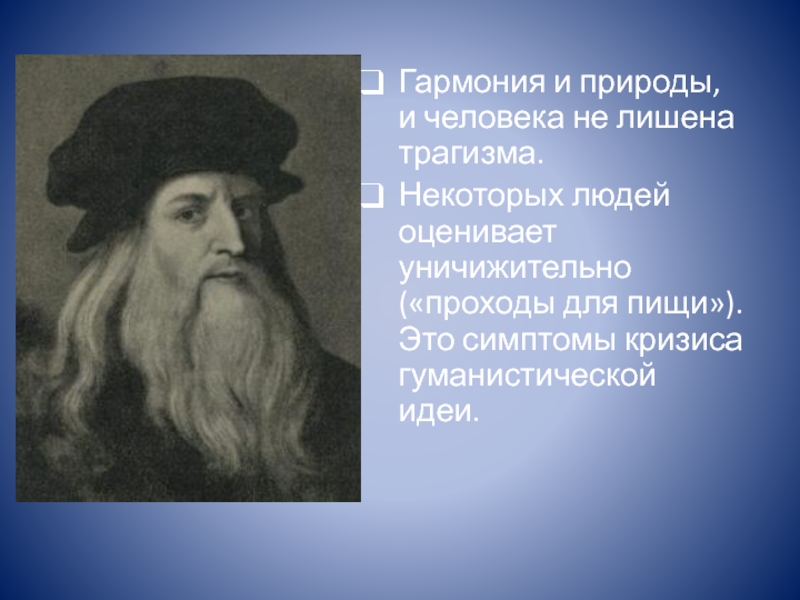Гармония и природы, и человека не лишена трагизма.Некоторых людей оценивает уничижительно («проходы для пищи»). Это симптомы кризиса