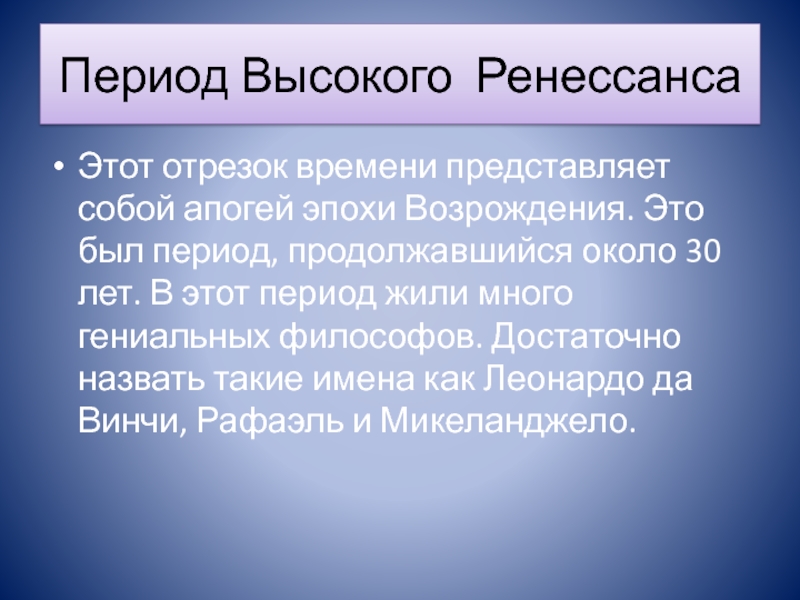 Период Высокого РенессансаЭтот отрезок времени представляет собой апогей эпохи Возрождения. Это был период, продолжавшийся около 30 лет.