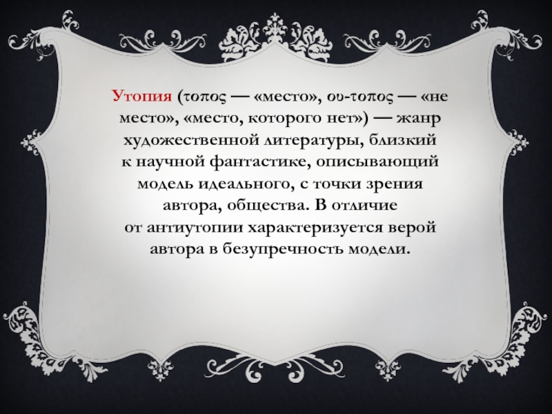 Слайд 2Утопия (τοπος — «место», ου-τοπος — «не место», «место, которого нет») — жанр художественной литературы, близкий