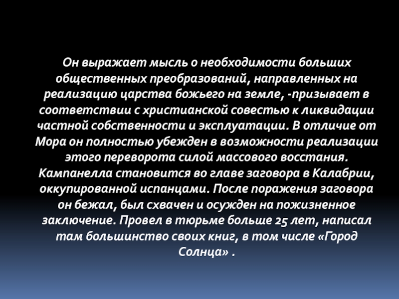совестью к ликвидации частной собственности и эксплуатации. В отличие от Мора он полностью убежден в возможности реализации этого переворота силой массового восстания. Кампанелла становится во главе заговора в Калабрии, оккупированной испанцами. После поражения заговора он бежал, был схвачен и осужден на пожизненное заключение. Провел в тюрьме больше 25 лет, написал там большинство своих книг, в том числе «Город Солнца» .